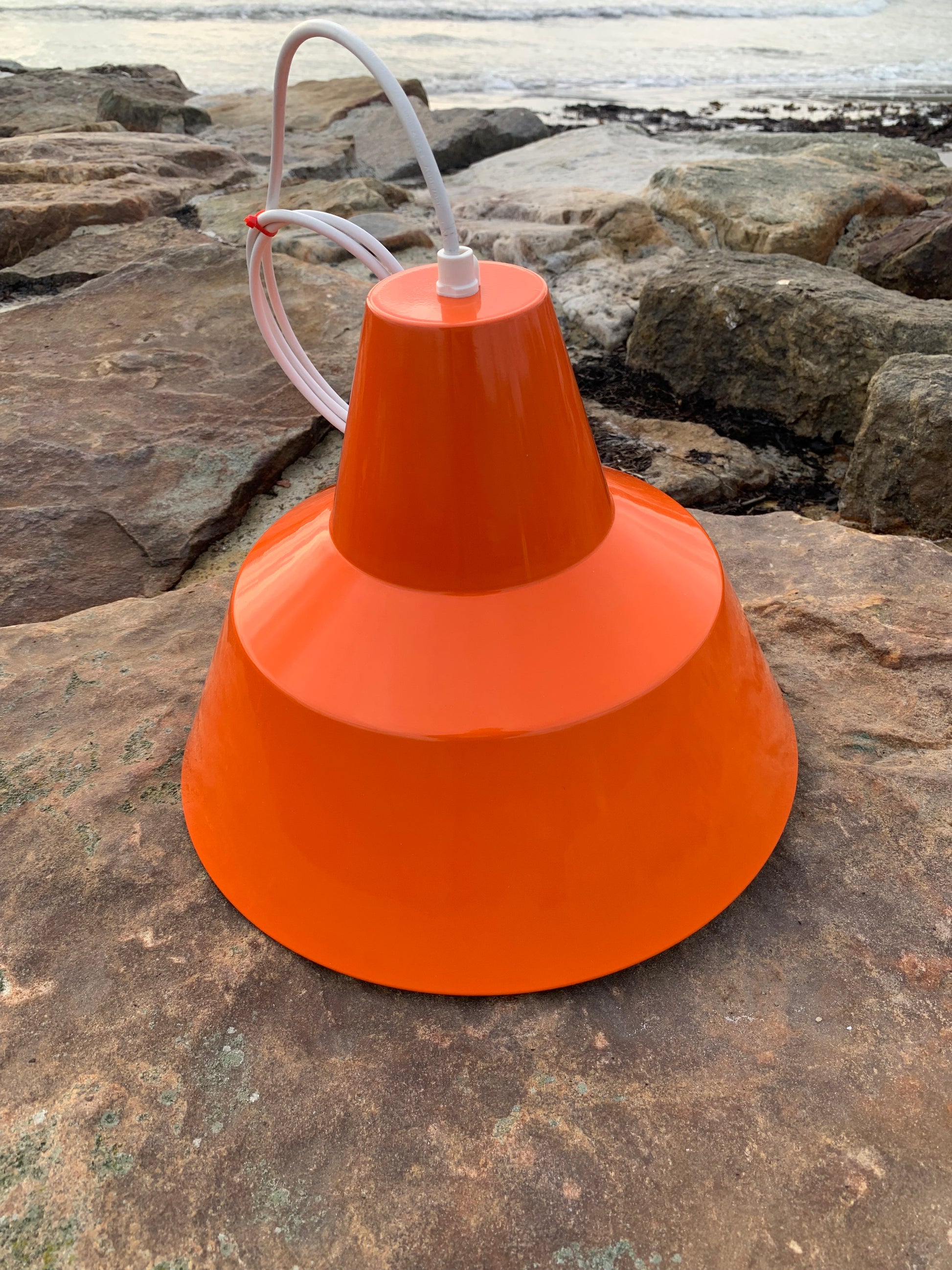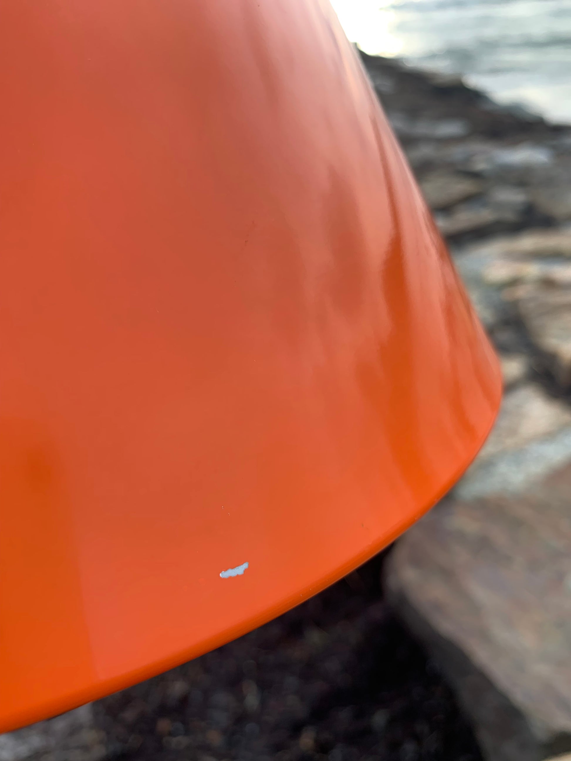 Verkstadslampa i klassiskt utförande. Lampan, som är nykopplad, har vissa åldersrelaterade tecken på slitage och en liten repa i kanten (se foto). Sammantaget är den dock i mycket gott vintageskick.