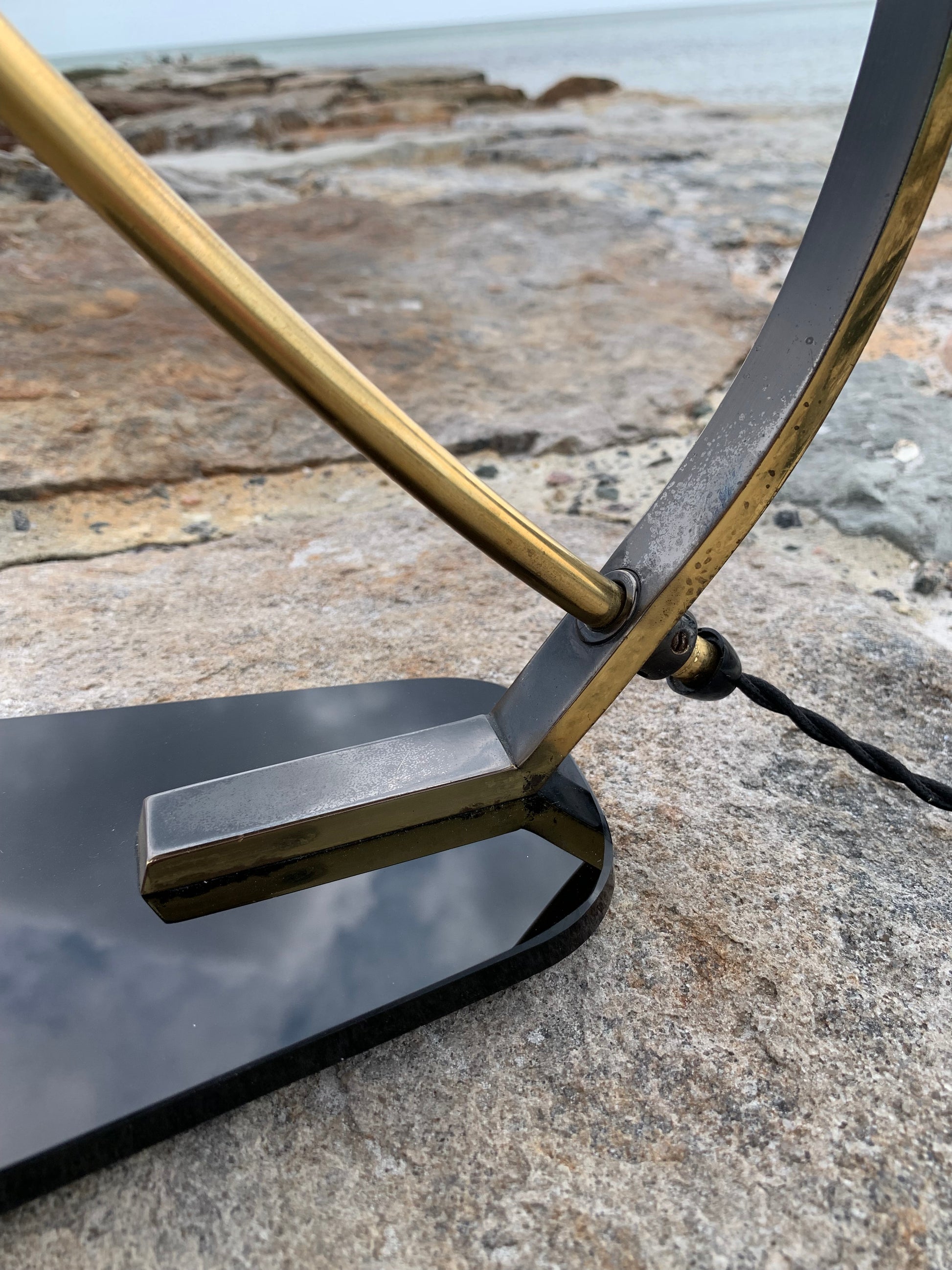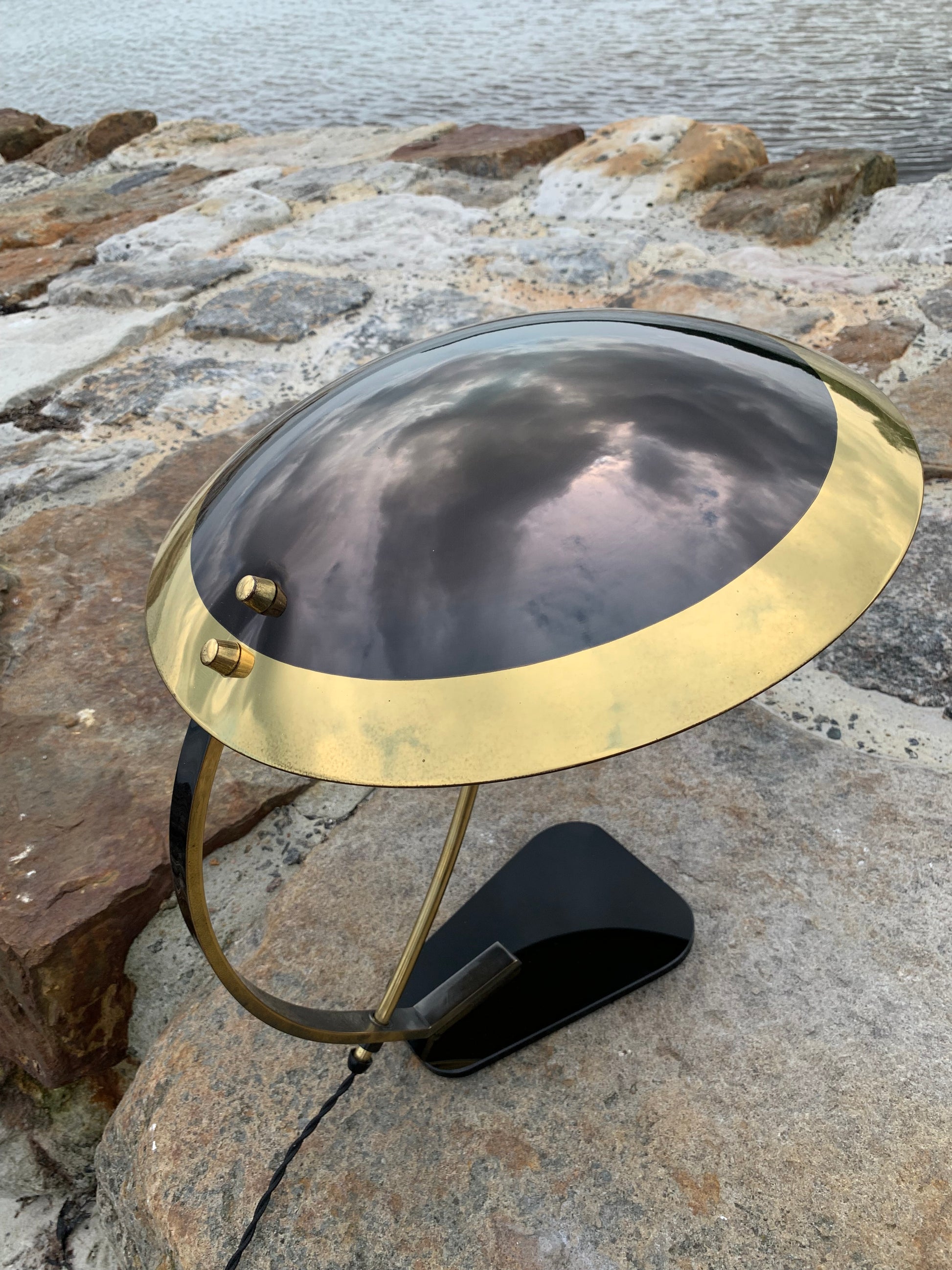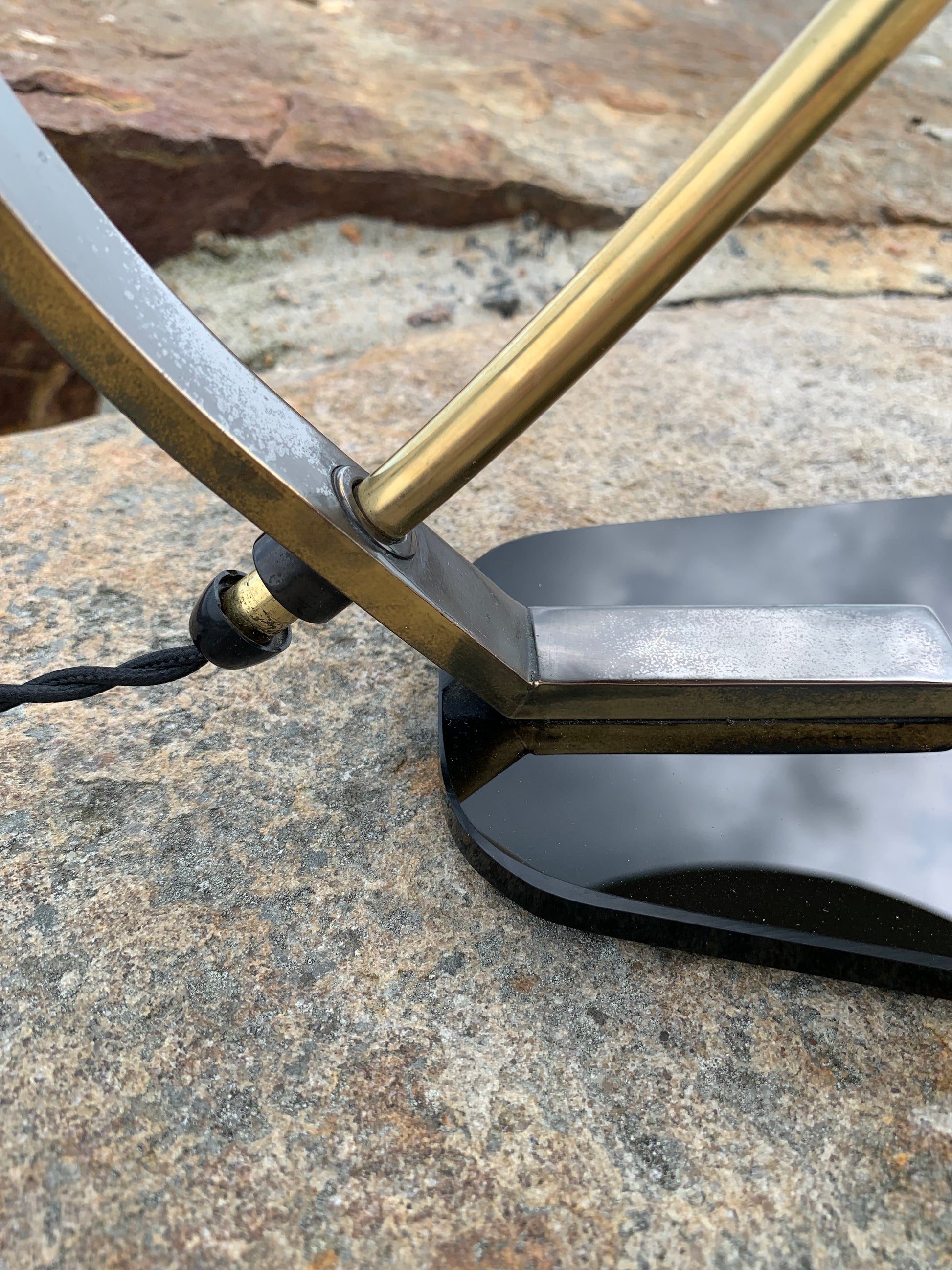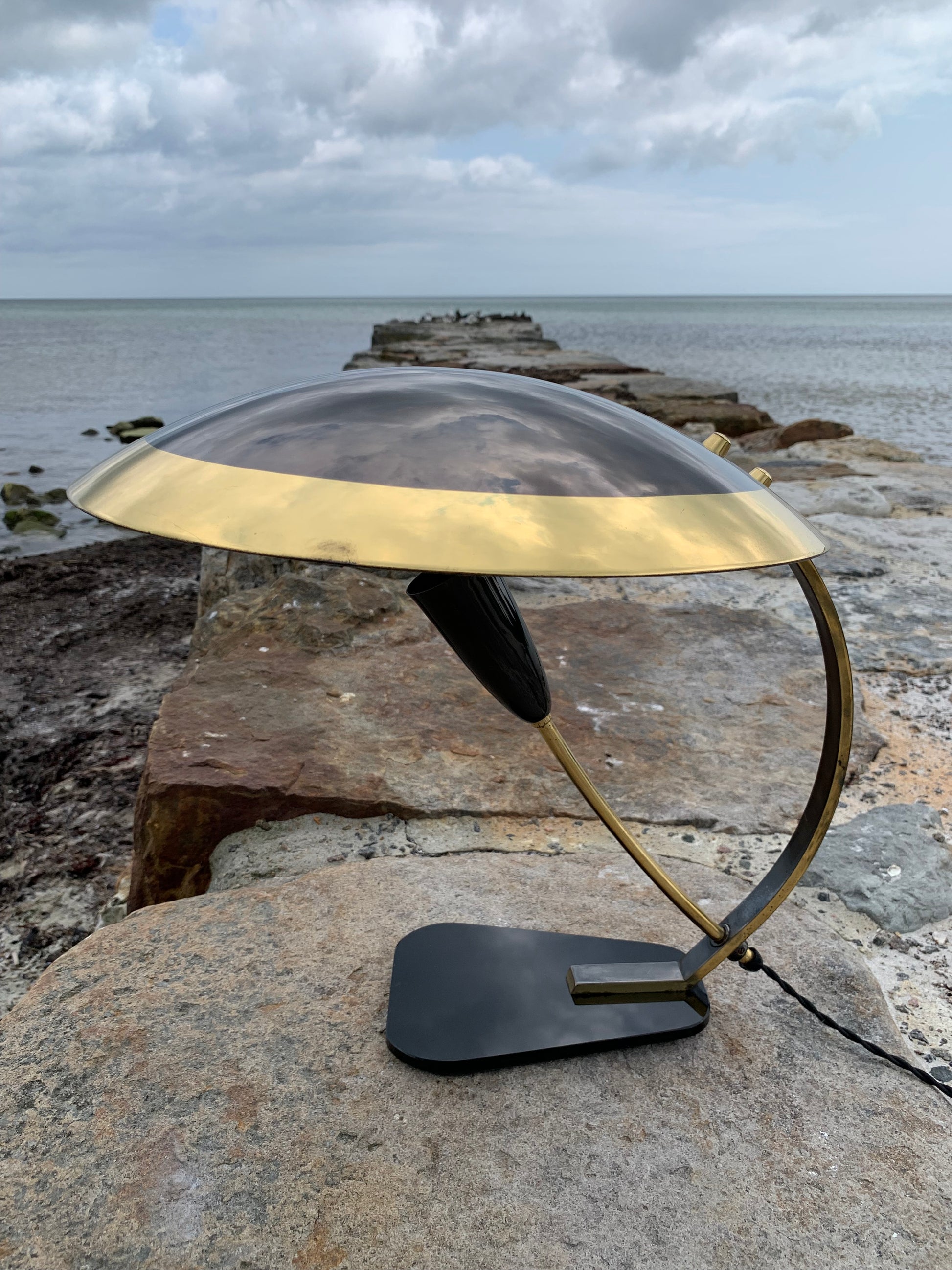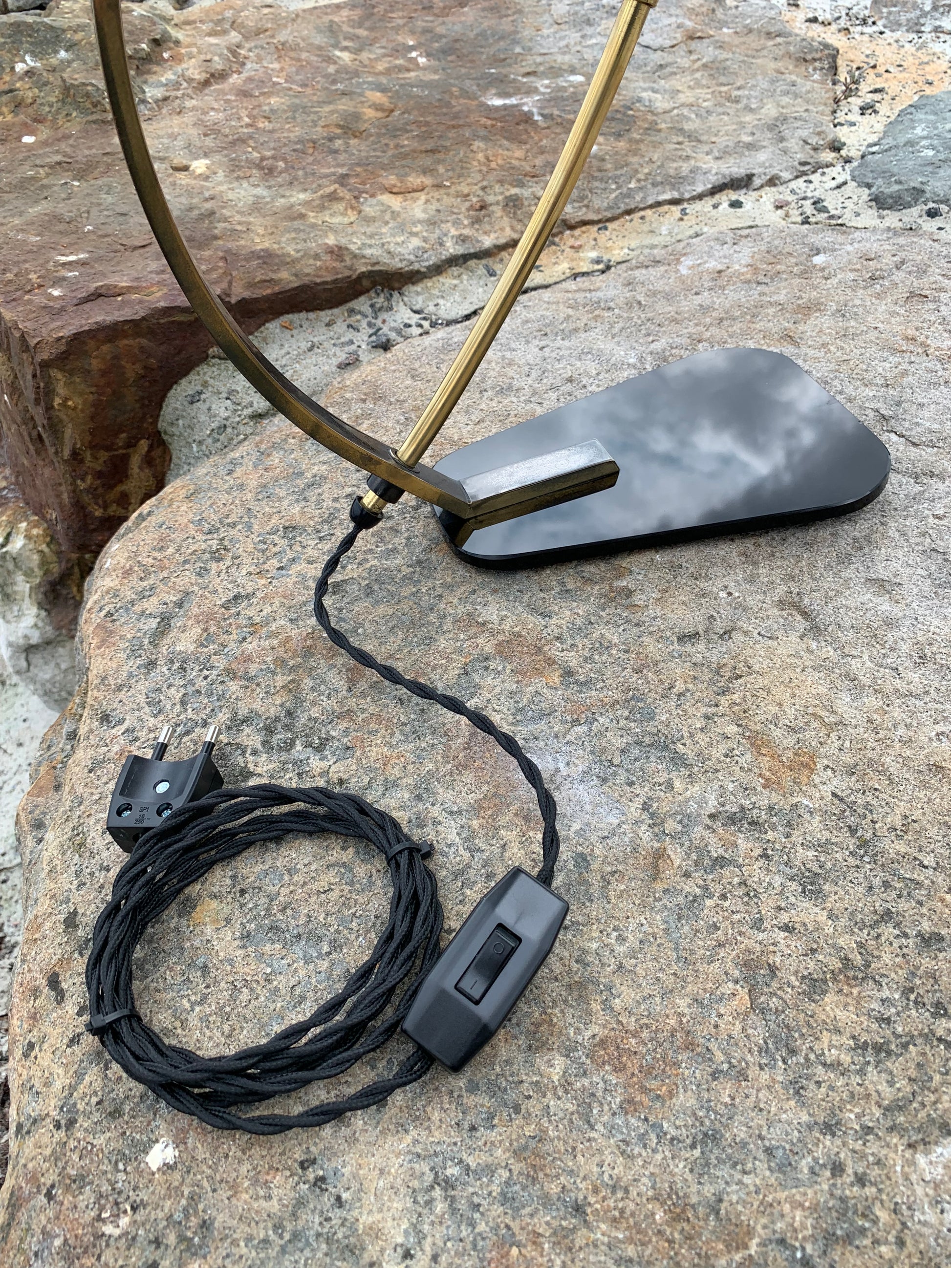 Vi har dock sett den här modellen omtalad som en Helo, vi tycker inte att den ser ut så. Säljaren vi köpte lampan av berättade att den var från Italien och från 1950-talet. Om du känner till modellen tar vi gärna emot lite synpunkter. Det är definitivt inte en lampa som många ser. Skicket är riktigt bra med tanke på åldern. Den har lite slitage, vilket en lampa i den åldern nästan borde ha, och en liten fläck på ena sidan av skärmen, men överlag är den i riktigt fint vintageskick och naturligtvis nykopplad.